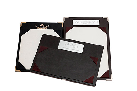 Our customized desk blotters have become a must have accessory to enhance your rooms, business center & meeting rooms. They provide protection for your furniture as well as ease for writing. Choose the material to match your hotel directory and other room accessories. Decoration options include engraved metal plates, foil stamping & debossing or blind debossing. Check our logo application section.