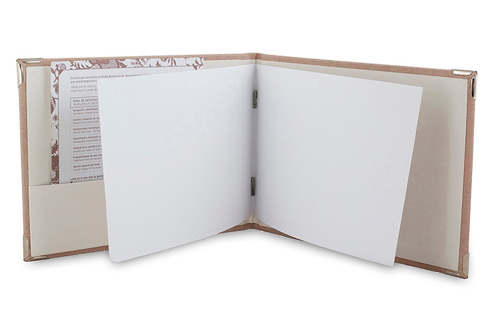 Elegant & easy for inner-sheet replacement. The elastic supports up to 15 120-gms folded sheets. The side pocket may carry post-cards & satisfaction surveys. Manufactured with fabrics of incredible textures & long durability for daily use. Sizes upon client´’s request.