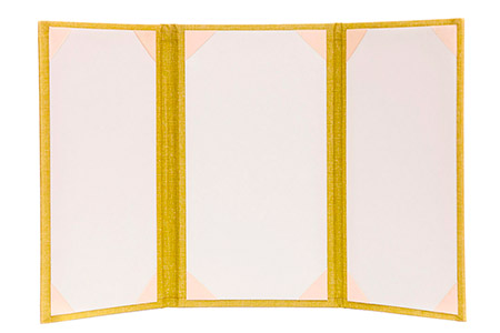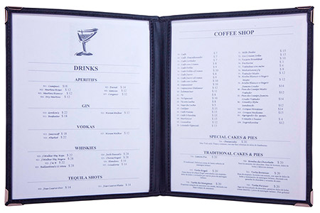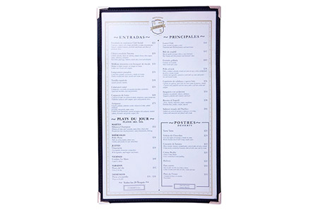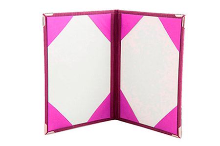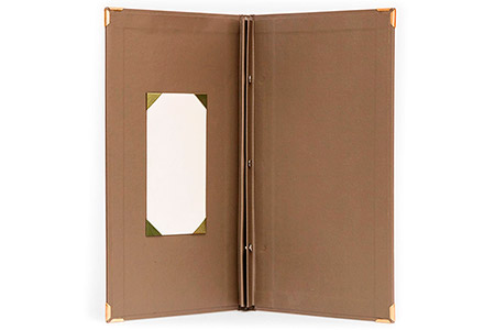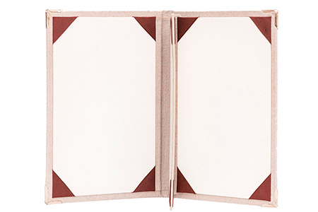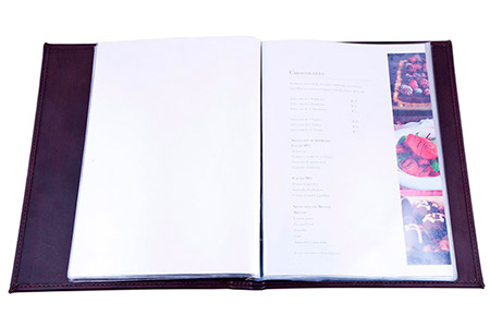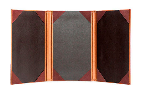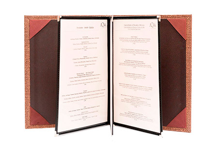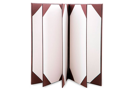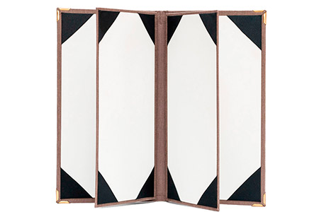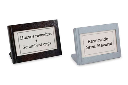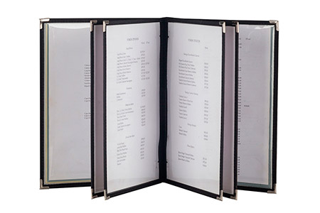 Among our exclusive range of restaurant accessories, these tent-stands offer a great first-sight visual communication with your guests. They are handy while elegant. Created for special luncheons, executive menus, buffets, cellar picks, daily specials, breakfast, etc. Manufactured with plain vinyl or textured vinyl fabrics.