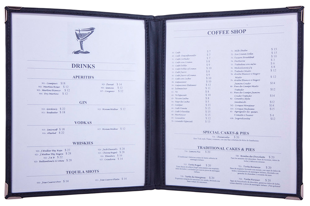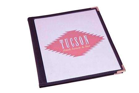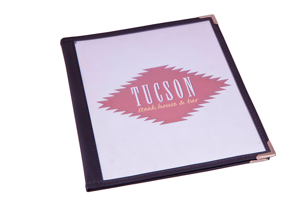 Min. Qty: 25 units. Manufacturing time: 7 days. Product in stock: single A4, LEGAL, A5. Double A4. 3-page-book A4. Products in stock are manufactured with black vinyl cloth & silver metal corners.