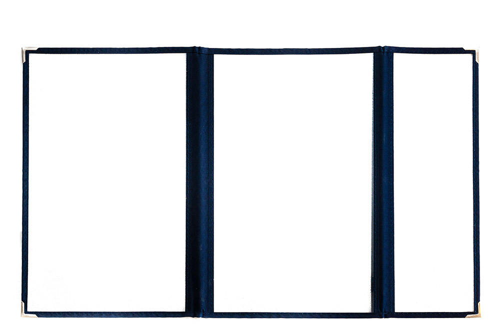 Min. Qty: 25 units. Manufacturing time: 7 days. Product in stock: single A4, LEGAL, A5. Double A4. 3-page-book A4. Products in stock are manufactured with black vinyl cloth & silver metal corners.
