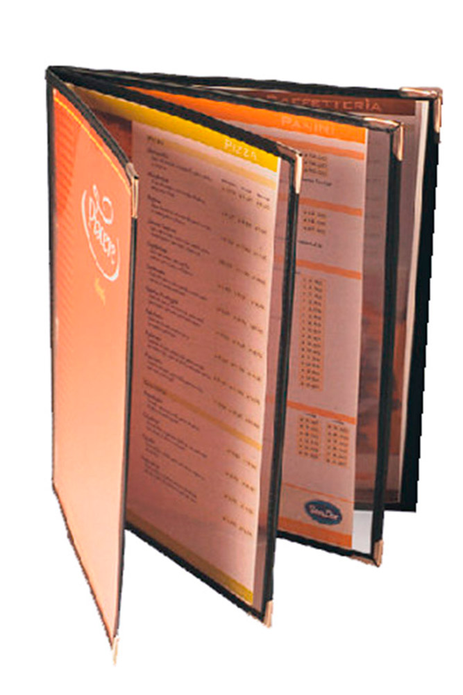 Min. Qty: 25 units. Manufacturing time: 7 days. Product in stock: single A4, LEGAL, A5. Double A4. 3-page-book A4. Products in stock are manufactured with black vinyl cloth & silver metal corners.