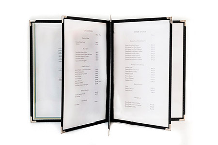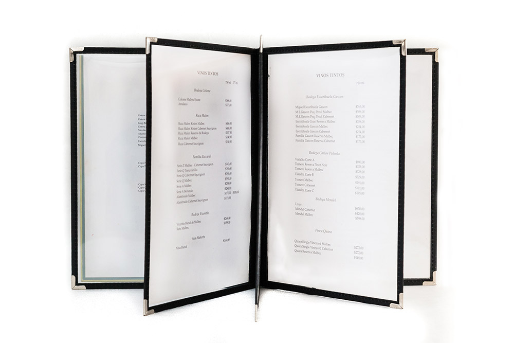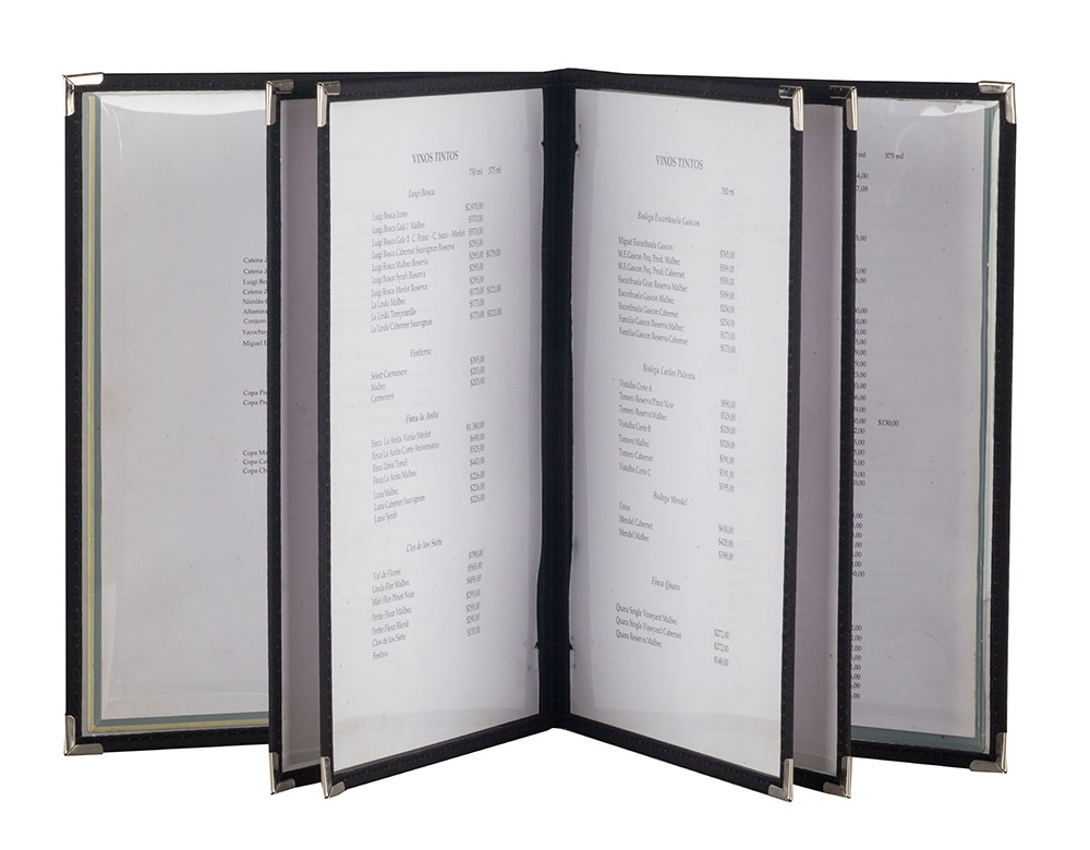 Min. Qty: 25 units. Manufacturing time: 7 days. Product in stock: single A4, LEGAL, A5. Double A4. 3-page-book A4. Products in stock are manufactured with black vinyl cloth & silver metal corners.