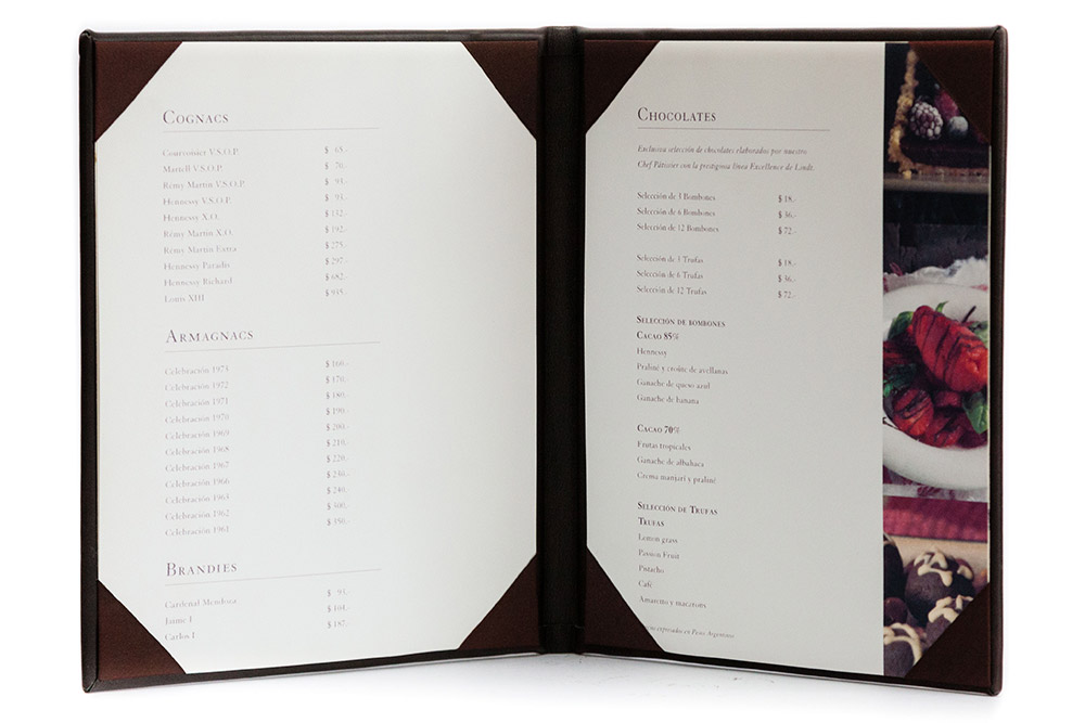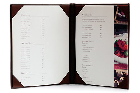 We carry a wide selection to hold two or more pages. Two panels for two views, vintage aesthetic special double for several pages, ring-binder double for long wine lists: all are included in the chart below.